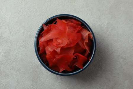 Bowl with red pickled ginger on white textured background, top view