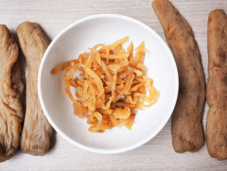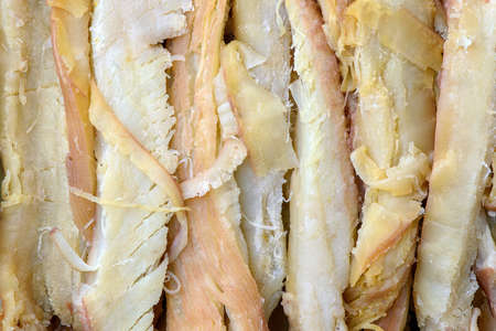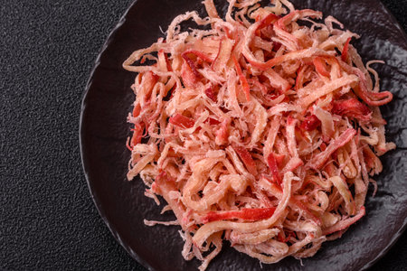 Food, dried squid in shavings or chopped as snacks or jerky. Snack dried squid for beer, background for your design