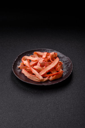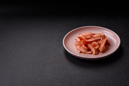 Dried chicken slices, jerky, with cherry or plum flavor, salt and spices on a dark concrete background