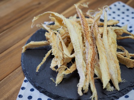 dried squid on small wooden plate