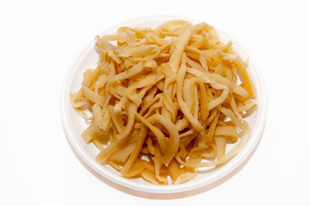 Preserved bamboo shoot slices on white background.