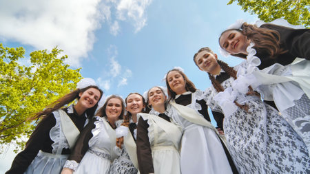 Smiling female graduates pose on the last day of school life.