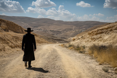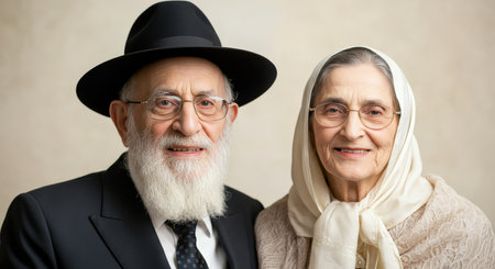 Elderly man with beard and wide-brimmed black hat stands against ancient stone architecture reflecting Jewish cultural heritage, national identity, wisdom, resilience, tradition and timeless legacy