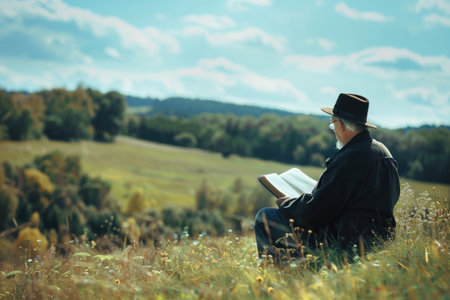 Elderly man reading a book in the field. Reading a book in nature.