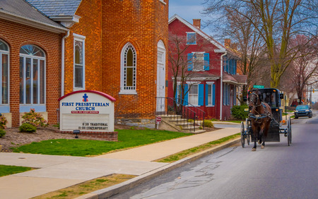LANCASTER, USA - APRIL, 18, 2018: View of old fashioned Amish buggy with a horse riding on the streets in urban street, crossing in front of a church