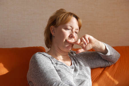 Sad senior blonde woman is sitting on a sofa at home