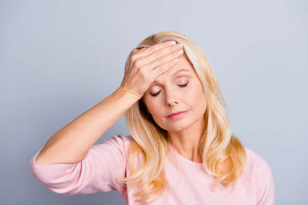 Close up portrait of sad upset unhappy beautiful lovely tender weak nervous feeling bad beautiful grandmother touching forehead with palm high temperature isolated on gray background