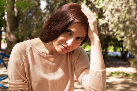 The young girl, the brunette in a pink jacket on the street in the park with a flowing hair, thinks, has put hands on the head
