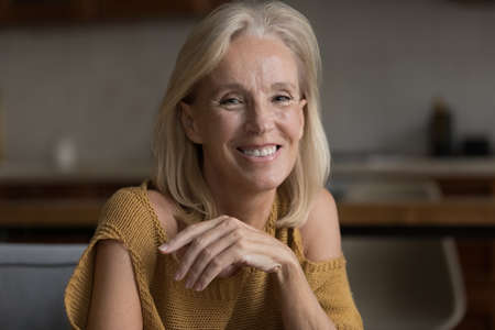 Happy cheerful skinny mature 60s woman home head shot portrait. Middle aged senior lady, pensioner, OAP sitting on sofa, looking at camera with toothy smile, posing, laughing