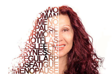 Text Portrait Poster of attractive mature lady with soft skin smiling isolated on white background, Caucasian woman but showing Indian or Arabic traits