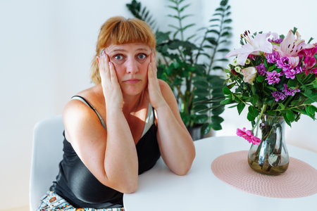 portrait middle-aged woman, in an upset mood, crying, sitting next to table on which there is bouquet flowers