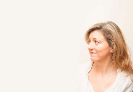 close-up portrait of beautiful mature blond Spanish woman in white staring skeptically