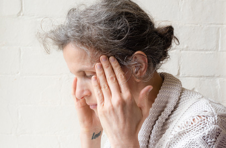 Side view of mature woman with grey hair using hands to rub temples with background of white brick wall