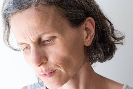Close up of distressed middle aged woman with grey hair, looking to the side (selective focus)