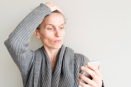 Middle aged woman making face and taking selfie with smart phone (selective focus)