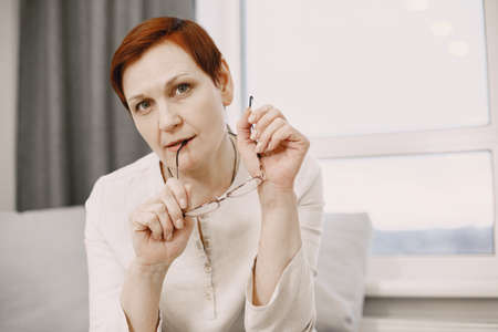 Mature stylish woman posing sitting on couch at home