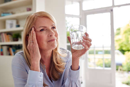 Menopausal Mature Woman At Home Suffering With Headache Pain Drinking Glass Of Water