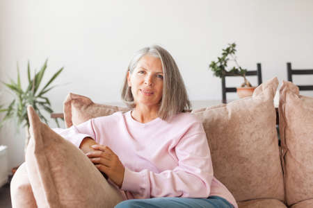 Portrait happy healthy middle aged woman sitting on comfortable couch at home. Smiling pleasant 50s elderly gray-haired mother looking at camera, posing in modern living room