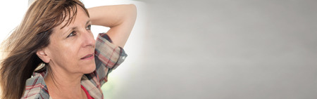 pride and arrogance - offended beautiful mature woman expressing sadness and depression with proud profile down, gray banner