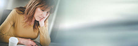 Exhausted businesswoman sitting at desk; panoramic banner