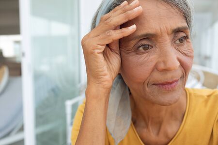 Front view of African American Woman inside a room with hand on the forehead. Authentic Senior Retired Life Concept