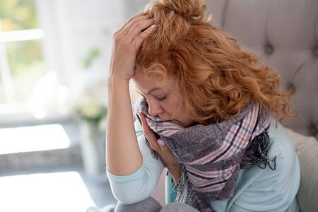 Falling asleep. Red-haired woman wearing scarf falling asleep while having fever