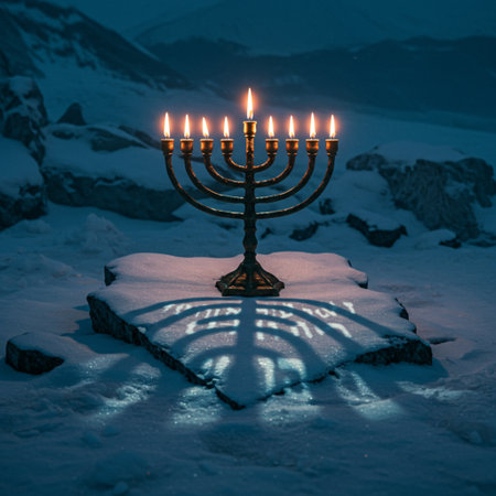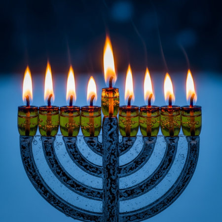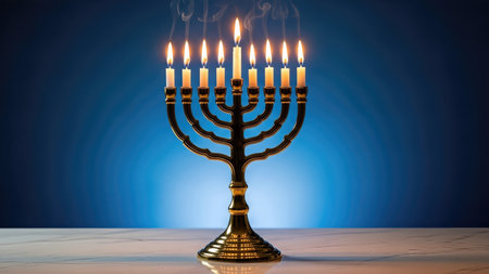 This stunning image features an intricate menorah adorned with candles, glowing softly in blue tones, perfect for evoking the spirit of Hanukkah.