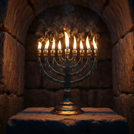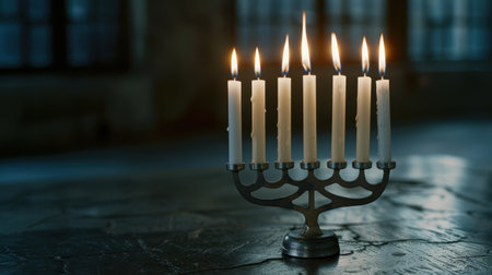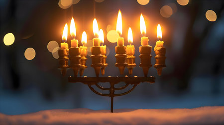 A glowing Hanukkah menorah with burning candles surrounded by soft warm lights. Perfect for celebrating the Jewish Festival of Lights, symbolizing hope, warmth, and tradition. Ideal for holiday greeting cards, blogs, and seasonal designs.