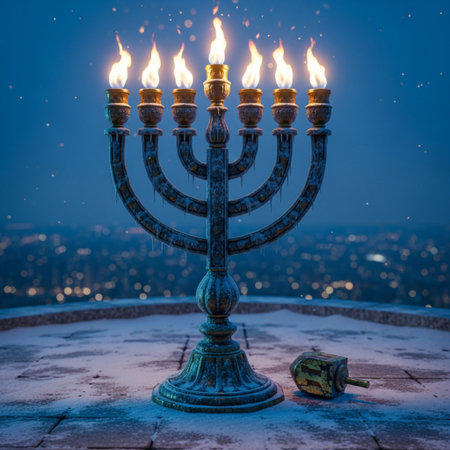 A glowing brass menorah with nine lit candles for Hanukkah. The warm, festive scene includes dreidels and gelt, creating a traditional mood. Ideal for holiday cards or cultural content.