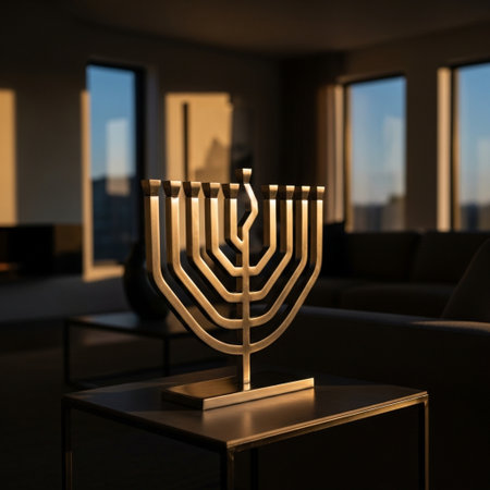 Soft candlelight from a decorative menorah creates a warm atmosphere in a dimly lit room, enhancing the festive spirit with floral elements nearby.