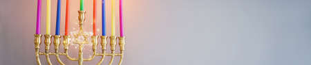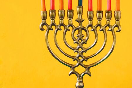 Hanukkah menorah with burning colored candles. Jewish holiday.