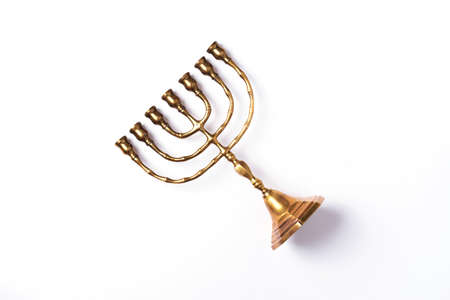 Golden hanukkah menorah on isolated on white background. Jewish holiday banner with copy space. Ancient ritual religious candle menorah