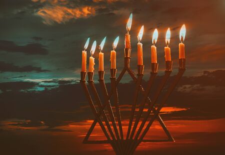 Jewish holiday Hanukkah with menorah traditional burning candles beautiful sunset sky in twilight background
