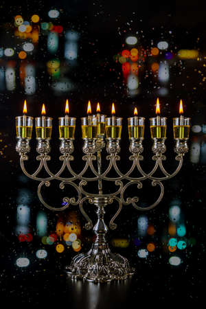 Jewish traditional lights holiday symbol Judaism Hanukkah menorah with are burning oil candles