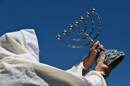 Orthodox Jewish man holding a temple Menorah against clear blue sky.