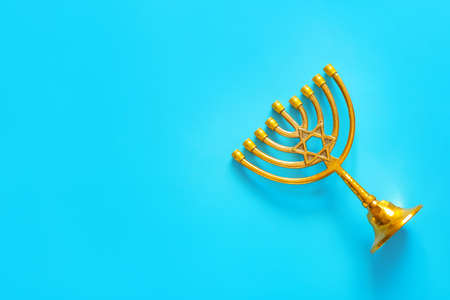 Jewish Hanukkah menorah on blue background. Top view Copy space