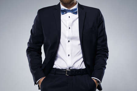 Stylish man groom buttoning a button on his jacket