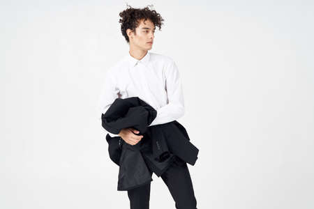 business guy curly hair jacket in hands fashion posing
