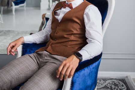 The groom puts on a jacket and vest before the wedding