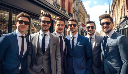 Outside the workplace, a group of businessmen wearing different suits are grinning and holding hands.