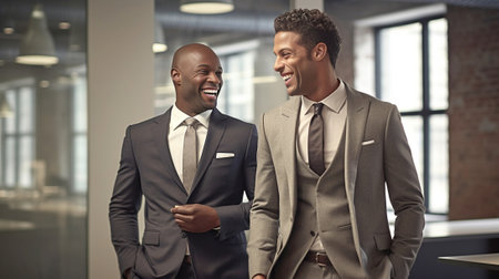 Confident businessman Cheerful young black man in formalwear standing on staircase and holding a laptop while three people talking on background : Generative AI
