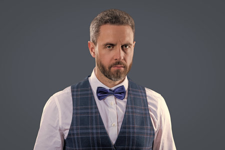 Handsome charismatic waiter man wear tux elegant bowtie ready to serve in classic uniform isolated on grey