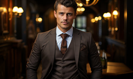 Stylishly dressed man in a tuxedo poses confidently in an elegant venue with warm lighting and an enchanting atmosphere Generative AI