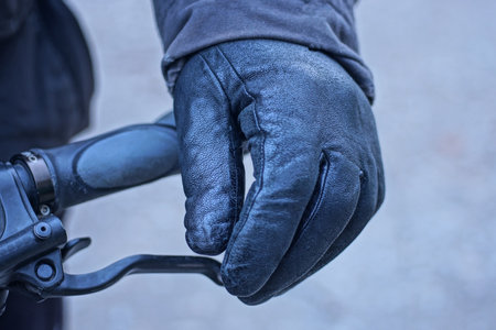 hand of one male cyclist in black leather glove holds plastic handlebar of bicycle on autumn street