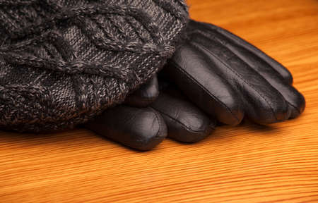Woolen scarf and gloves on wooden background