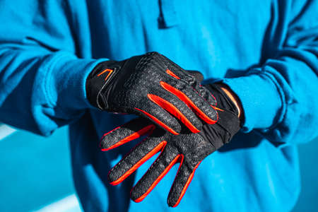 Male keeping his hands in protective black gloves together while standing at the stadium