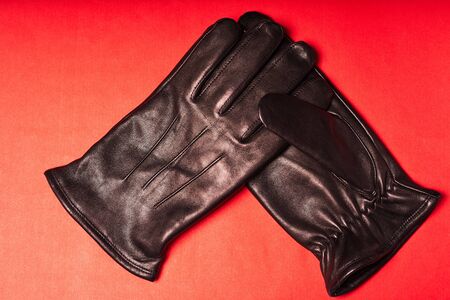Black Winter Leather Gloves for Men on red background.