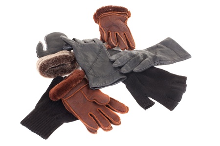Various types of gloves on a white background. View from above.