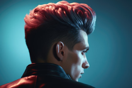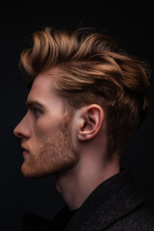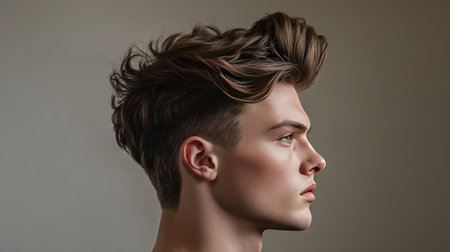 Profile view of a young man sporting a textured quiff haircut against a dark background