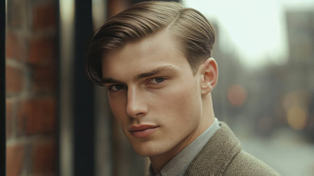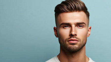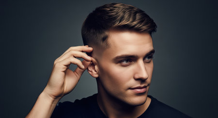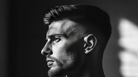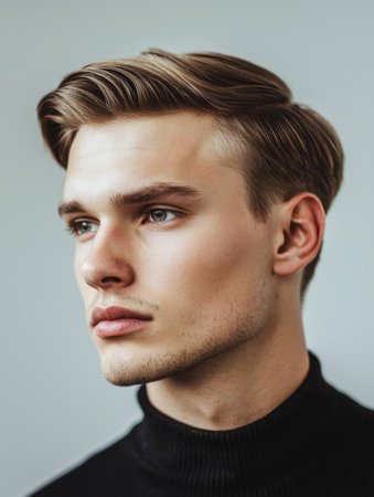 Captivating portrait of a young man showcasing a stylish haircut. The soft light enhances his features, reflecting confidence and modern grooming trends.
